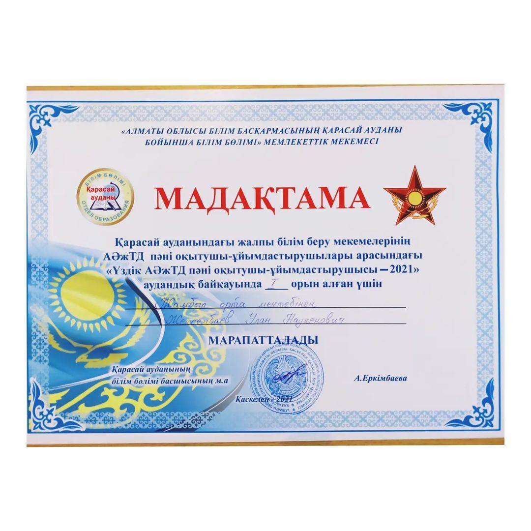 Қарасай аудандық Жалпы орта білім беру мекемелерінің "Үздік АӘ және ТД пәнін оқытушысы 2021" байқауына қатысып Жексембаев Улан Наукенович ☆1☆ орынға ие болды. Жеңісіңіз құтты болсын ! Жамбыл мектебі құттықтайды !