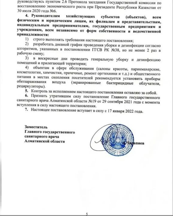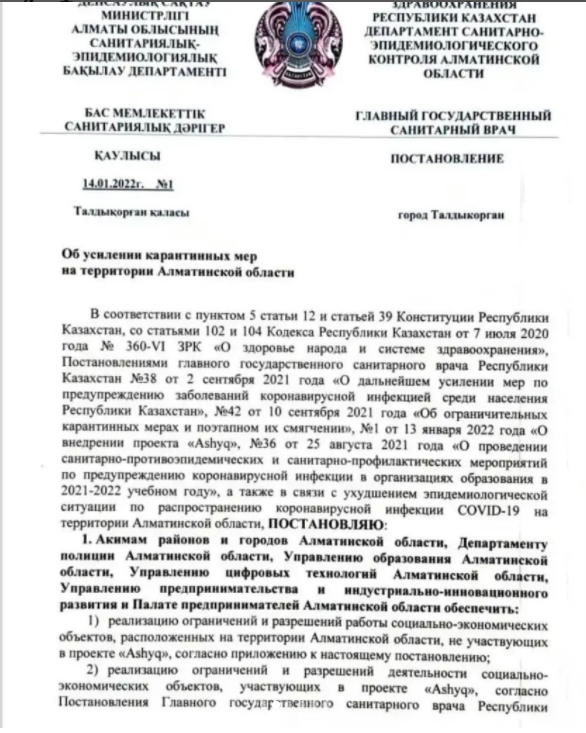 На основании постановления главного государственного санитарного врача об усилении карантинных мер на территории Алматинской области от 14.01.2022 в связи с ухудшением эпидемиологической ситуации по распространению короновирусной инфекции COVID-19 на
